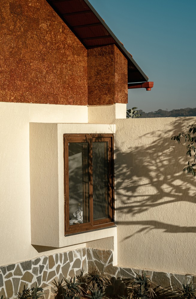 Tính bền vững của ngôi nhà được xem xét kỹ lưỡng. Những thiết kế đan xen bằng vật liệu bản địa như đá laterite làm tường, đá kota làm sàn, tường trát bùn phủ vôi mang đến cảm giác ấm áp tự nhiên.