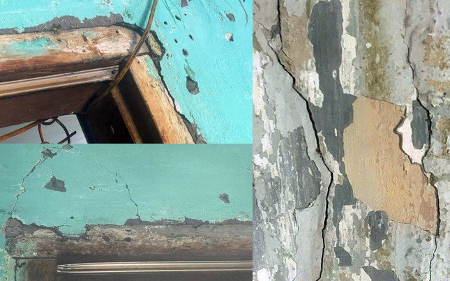 Bên trong căn biệt thự cổ 88-90 Điện Biên Phủ (Hải Phòng) xuất hiện nhiều vết nứt tường, vữa trát bở bong tróc.
