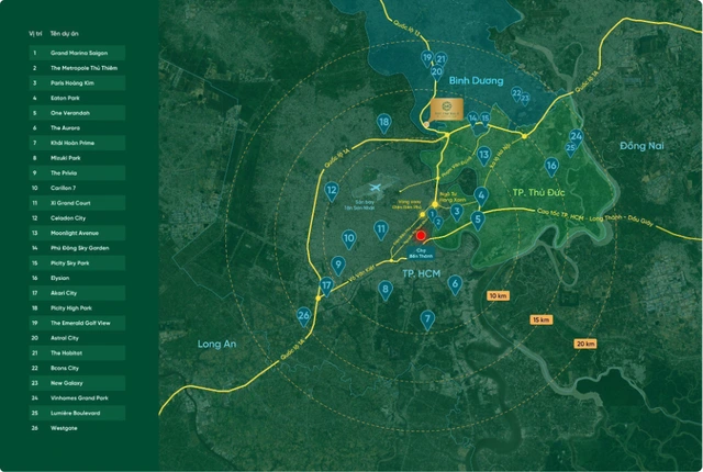 Các dự án càng gần quận 1 như The Emerald 68 (chỉ cách 11,5km) càng có xu hướng giá cho thuê và tiềm năng tăng giá cao hơn